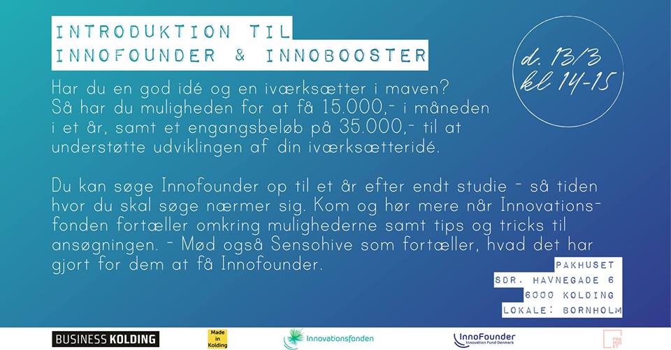 Den 13. marts fortæller Innovationsfonden omkring mulighederne samt tips og tricks til ansøgningerne til InnoBooster og InnoFounder. Virksomheden Sensohive fortæller desuden, hvad det har gjort for dem at få Innofounder.