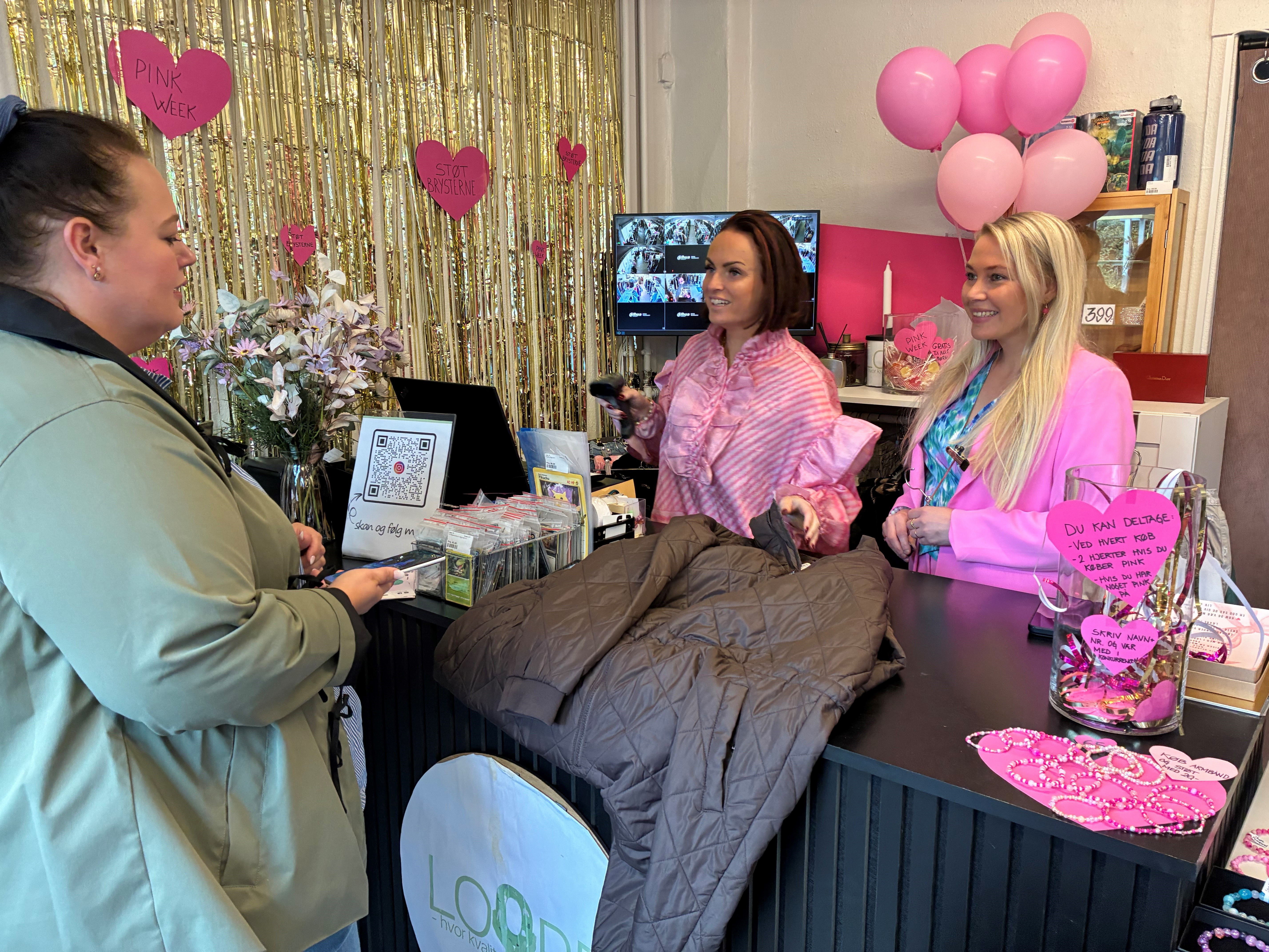 Nadia Nyborg Johansen er trukket i det lyserøde jakkesæt, og ved siden af hende hænger lyserøde balloner, mens væggen bag ved hende er beklædt med guldglimmer og hjerter, hvor der står Støt brysterne på.